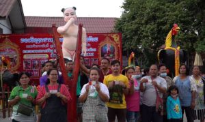 ทุกคนได้นำน้ำแดง ขนมขบเคี้ยว พวงมาลัย จำนวน 99 ชุด และไฮไลต์สำคัญคือ การนำห นังสติ๊กยักษ์ยาว 2 เมตรทำจากไม้สักทอง มีหนั งยางสำหรับยิง มาแก้บน หลังถวายทุกคนได้ร่วมกันทดลองยิ งคำว่า “ส้มฉุนพารวย” ขึ้นฟ้าให้กระจัดกระจายไปทั่วทุกพื้นที่