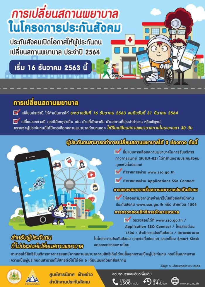 นายทศพล กฤตวงศ์วิมาน เลขาธิการสำนักงานประกันสังคม กระทรวงแร งงาน เปิดเผยว่า สำนักงานประกันสังคม ได้เปิดให้ผู้ประกันตนสามารถแจ้งขอเปลี่ยนแปลงสถานพย าบาลประจำปี 2564 หรือสนใ จจะเปลี่ยนสถานพย าบาลระหว่างปี ด้วยเห ตุจำเป็น สามารถยื่นแบบเลือกสถานพย าบาลในการรับบริการทางการแพทย์ ได้ที่สำนักงานประกันสังคมทุกแห่งทั่วประเทศ หรือทำรายการผ่านเว็บไซด์สำนักงานประกันสังคม หรือทำผ่าน Applications SSO Connect ได้ตั้งแต่ 16 ธันวาคม 2563 ไปจนถึงวันที่ 31 มีนาคม 2564